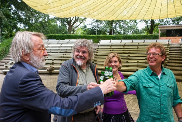 De media was woensdagmorgen massaal uitgerukt naar ons openluchttheater om de hoofdrolspelers van het verboden concert van Normaal (37 jaar geleden!) te ontmoeten. Gert Gossink (destijds ambtenaar van de gemeente Eibergen), concertorganisator Pim Bottenberg en Bennie Jolink waren in het theater voor een ‘wiedergutmachung’ . Om het ijs te breken bood Angelique Degen namens het openluchttheater een koel biertje aan. Ook kregen Gossink en Bottenberg VIP-kaarten voor het Normaal-concert van donderdag. We zijn er zeker van dat ze morgen gebroederlijk naast elkaar staan. Er zijn nog online tickets voor het unieke ‘inhaalconcert’ verkrijgbaar via de website www.openluchttheatereibergen.nl . Morgen zijn er opnamen te zien op TV Gelderland (18.15 uur). Radio 1 zond vanochtend live drie blokken uit vanuit ons theater. Ook De Telegraaf en TC Tubantia waren met een fotograaf ter plekke.